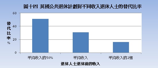 根據經濟合作發展組織的研究[9],透過三條支柱的互相配合,英國的公共退休計劃(即未計算私人機構的自願退休計劃),可為低收入人士(平均收入的50%)提供約五成的替代比率,為中等收入人士(等如平均收入) 提供三成的替代比率,為高收入人士(平均收入2倍)提供約高於一成半的替代比率(圖十四)。